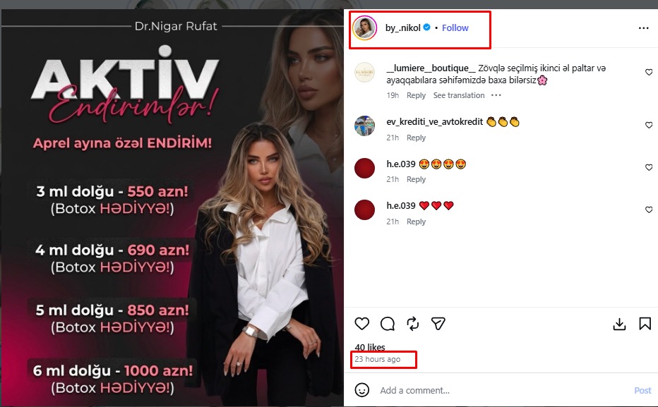 Nigar Rüfət isə fəaliyyətini gizli şəkildə etmir, sosial şəbəkələrdə də aktiv paylaşımlar edir. Ötən gün o, aprel ayına özəl endirim kampaniyasına start verdiyini pasiyentlərinə elan edib.