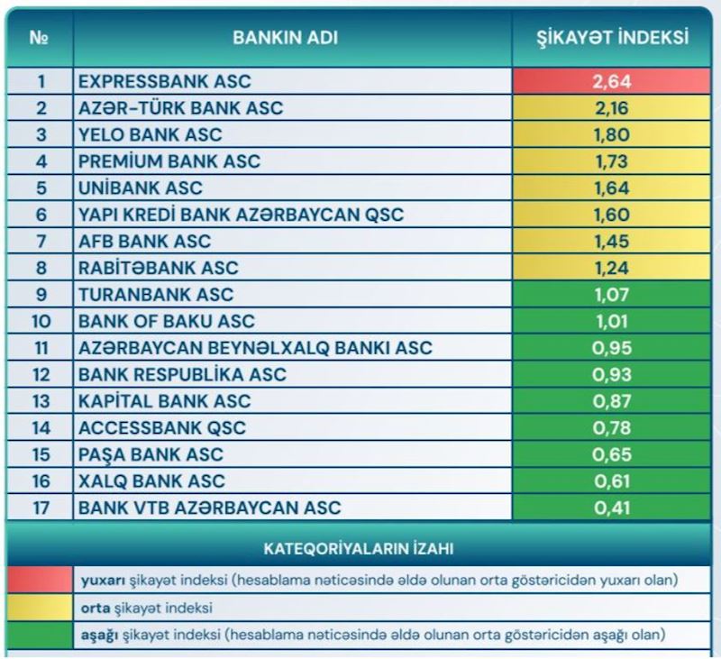 Şikayət olunan bankların siyahısında “Azər-Türk Bank” ASC ikinci, “Yelo Bank” ASC isə üçüncü olub.